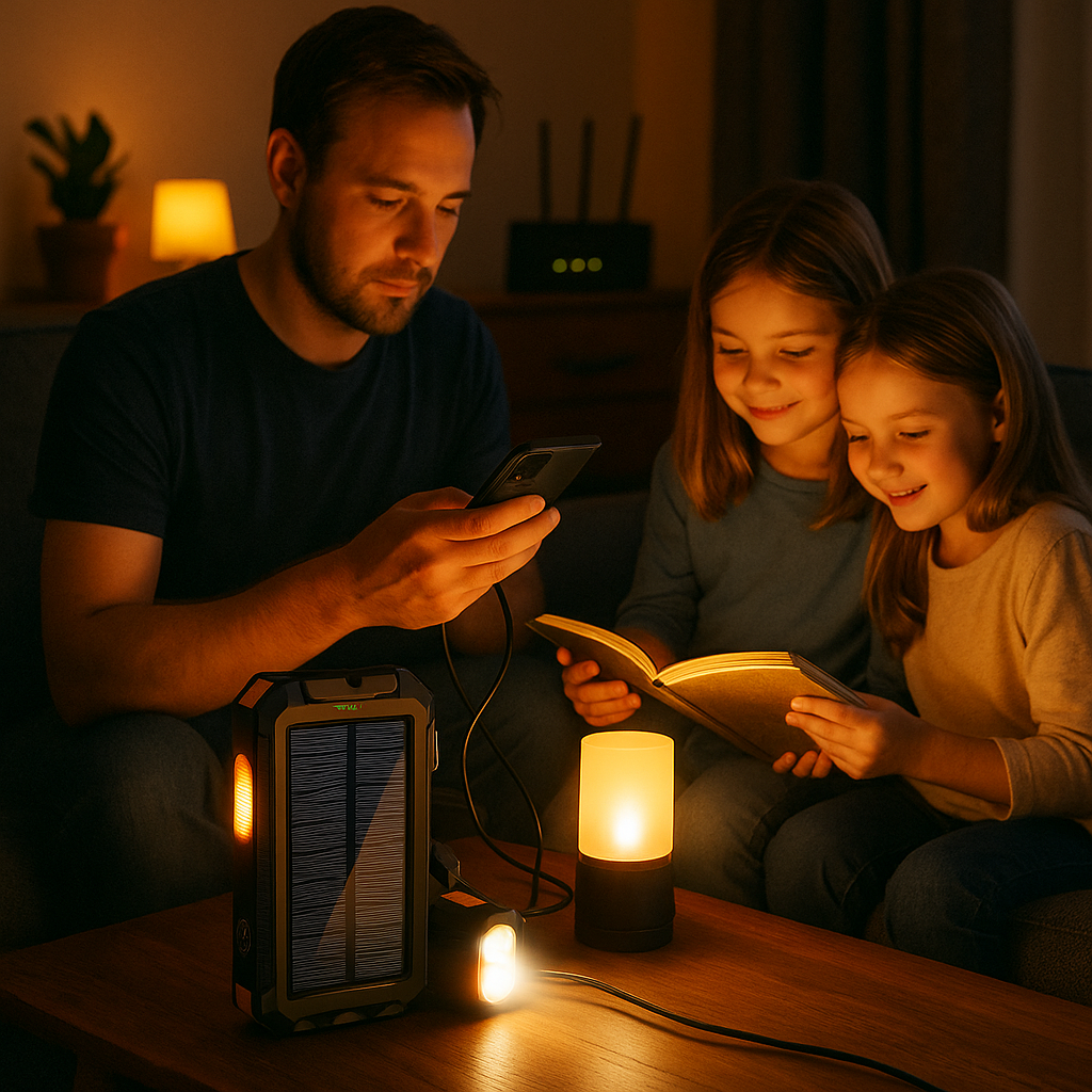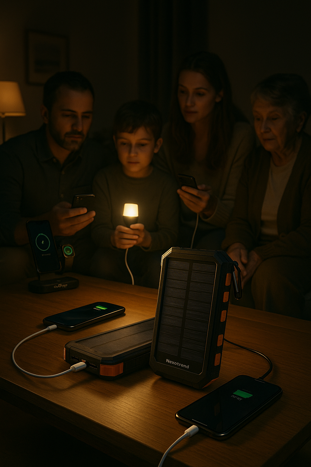 1 uur volle zon ≈ 10 % capaciteit. Voor complete lading adviseren wij netstroom of auto‑lader vóór de storm.