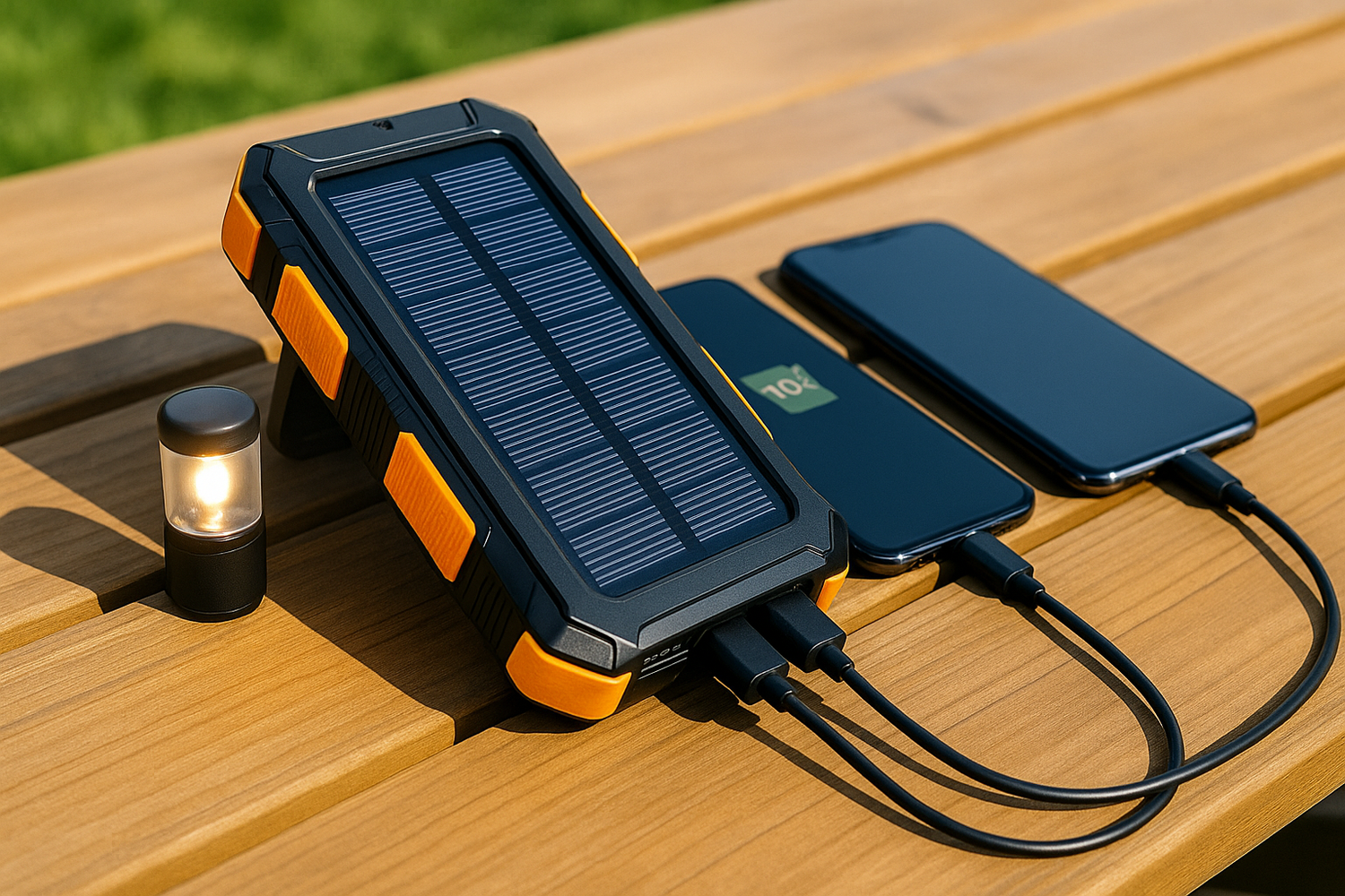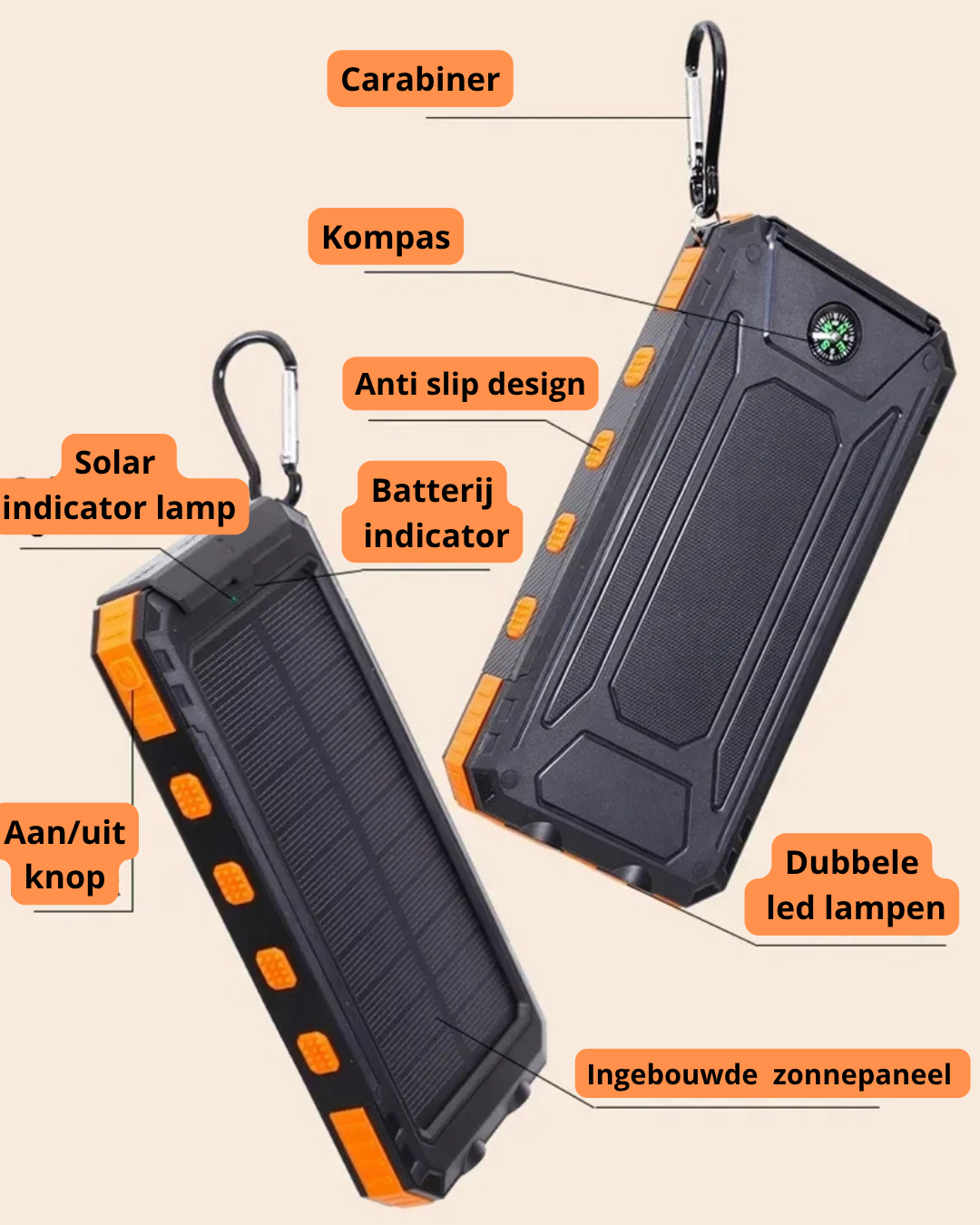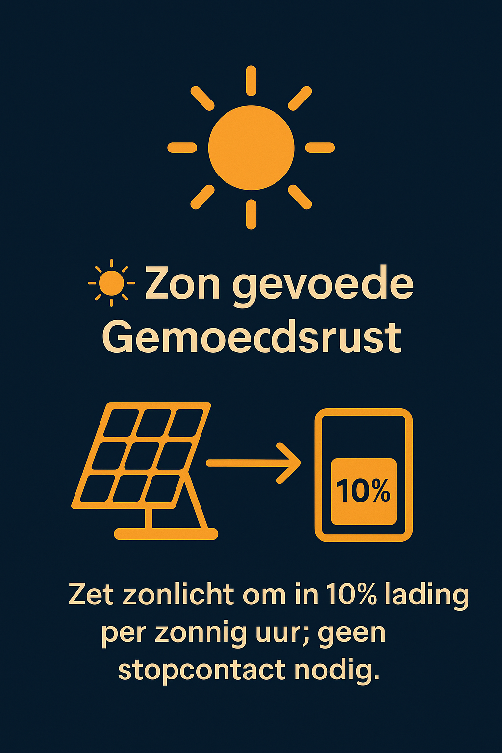 Zet zonlicht om in 10 % lading per zonnig uur; geen stopcontact nodig.