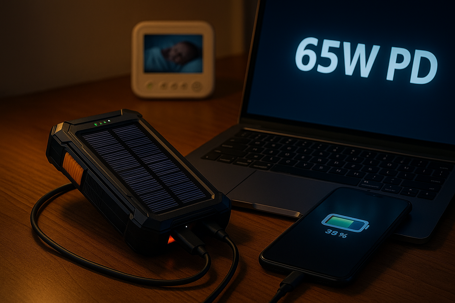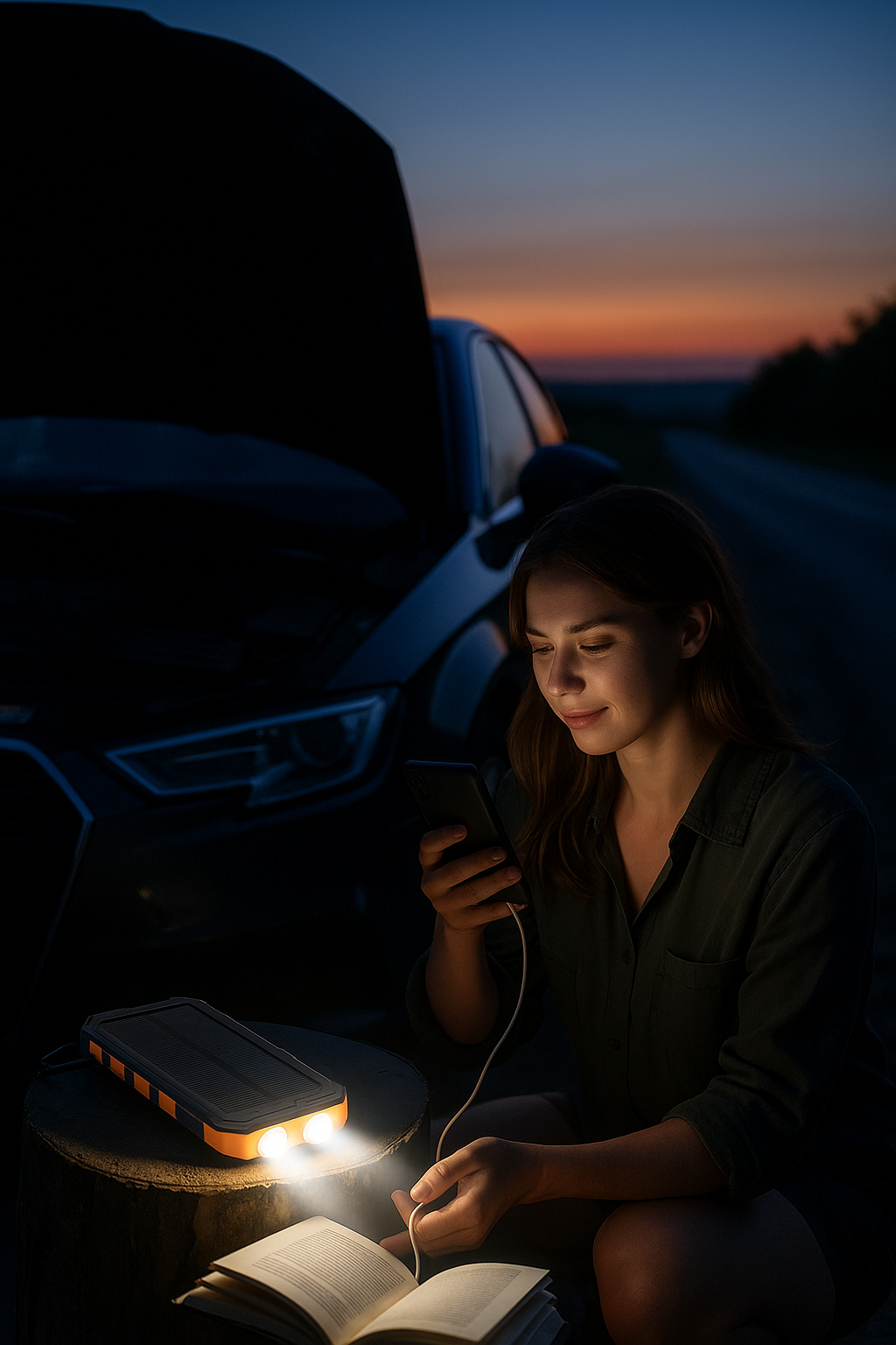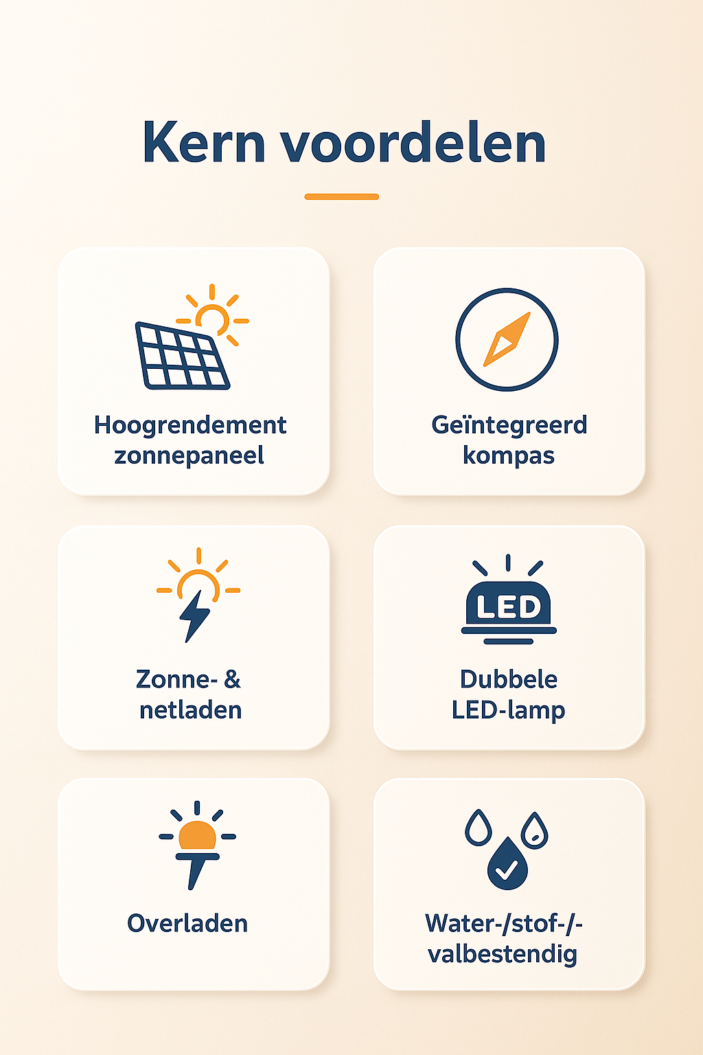 Zet zonlicht om in 10 % lading per zonnig uur; geen stopcontact nodig.