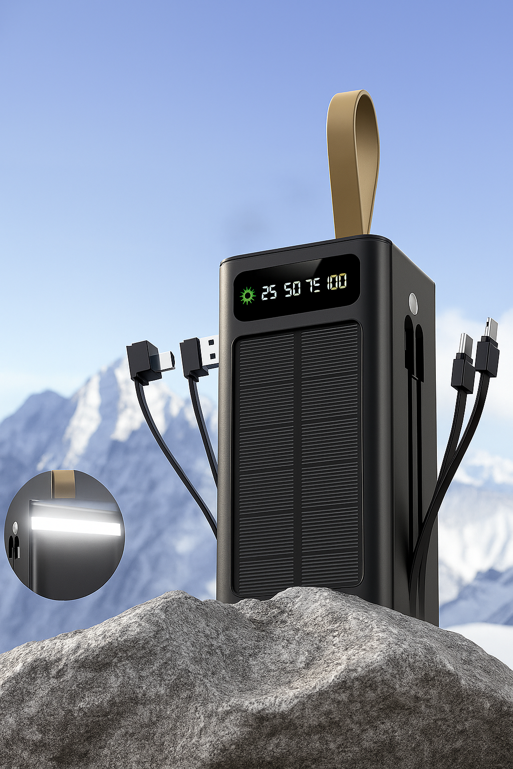 De volgende generatie nood‑energie: 50 000 mAh echte capaciteit, 100 W USB‑C PD, uitvouwbare zonnevleugels en draadloos Qi‑laden.